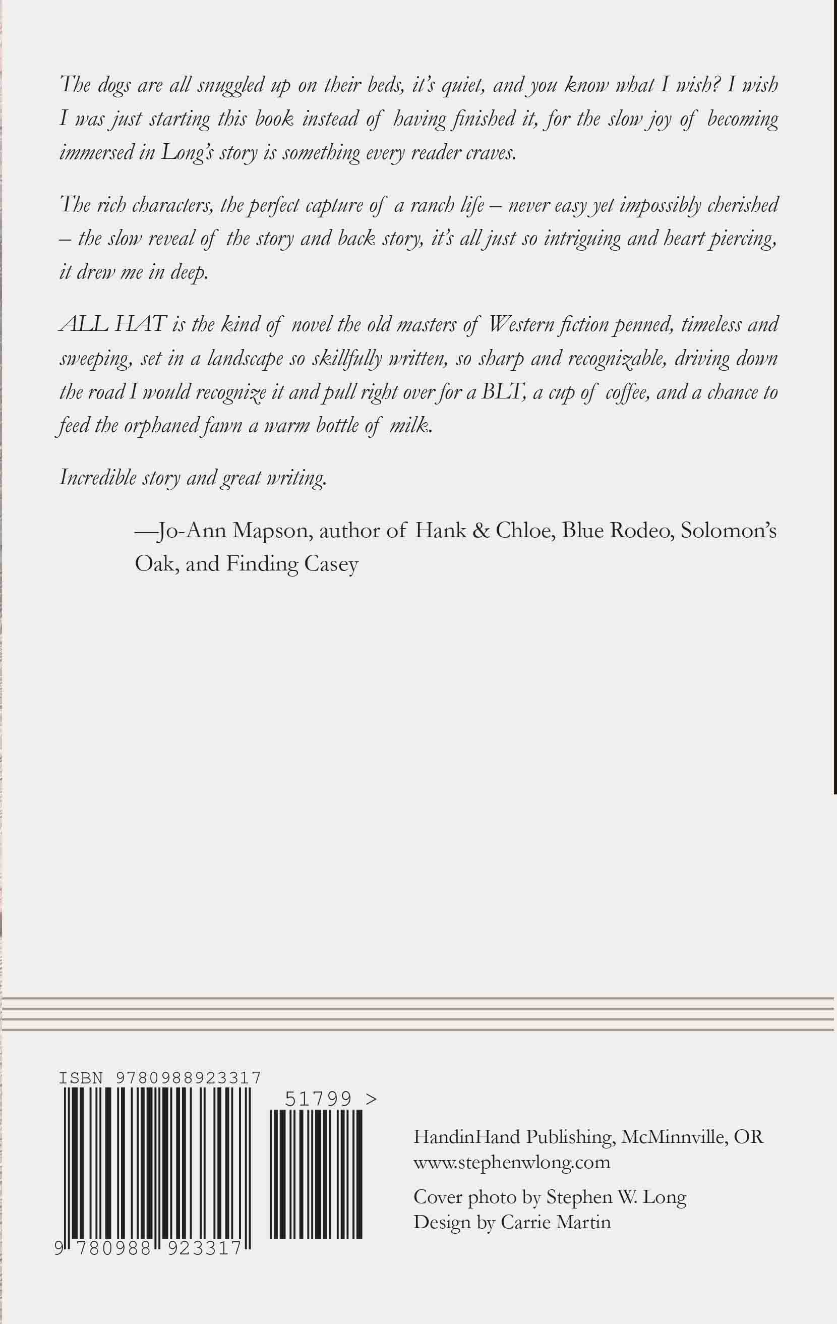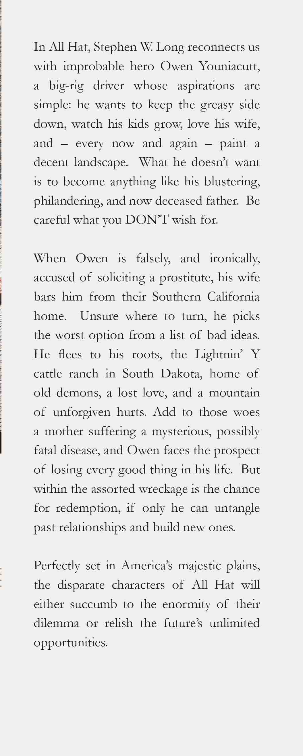 In All Hat, Stephen W. Long reconnects us with improbable hero Owen Youniacutt, a big-rig driver whose aspirations are simple: he wants to keep the greasy side down, watch his kids grow, love his wife, and – every now and again – paint a decent landscape. What he doesn’t want is to become anything like his blustering, philandering, and now deceased father. Be careful what you DON’T wish for.
